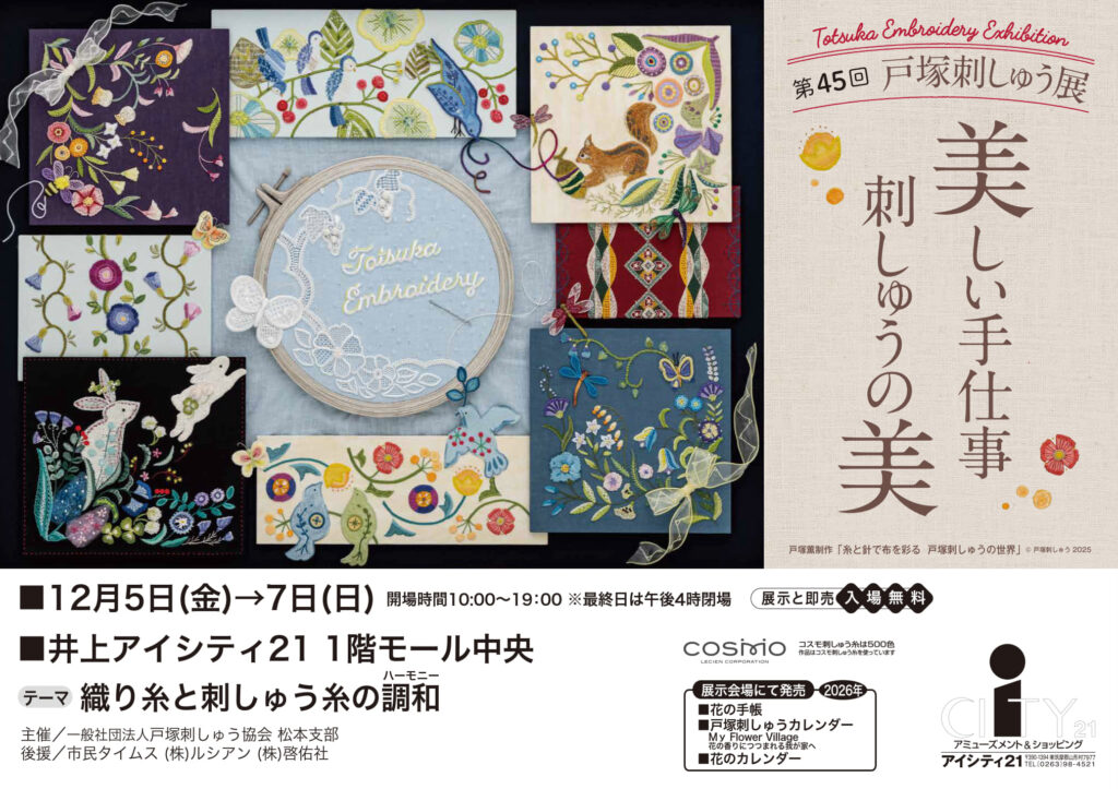 「戸塚刺しゅう展」12/5(金)より開催 会期:12/5(金)~12/7(日)最終日16時まで 入場無料 場所:1階モール中央特設会場 「アルパカ&カシミヤ ニット・コー... コムサイズムショップニュース「シャ...