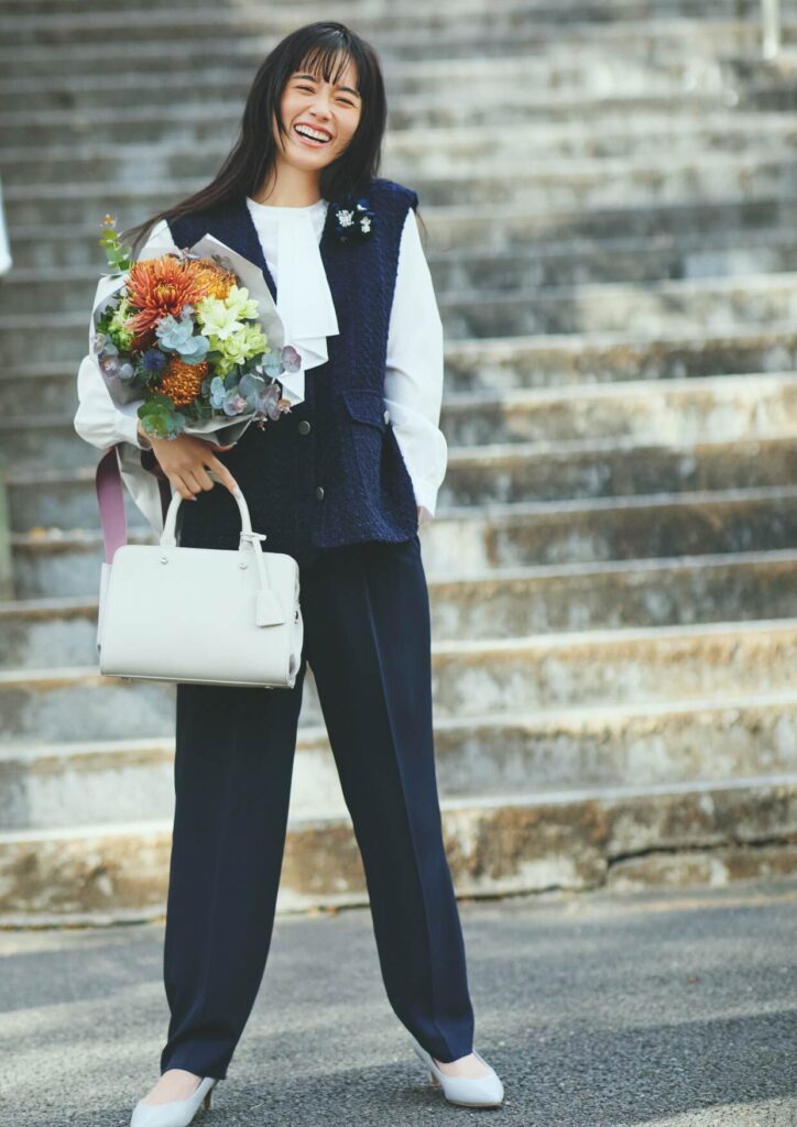 羽織るだけで縦のラインを強調し、すっきりとした印象に。