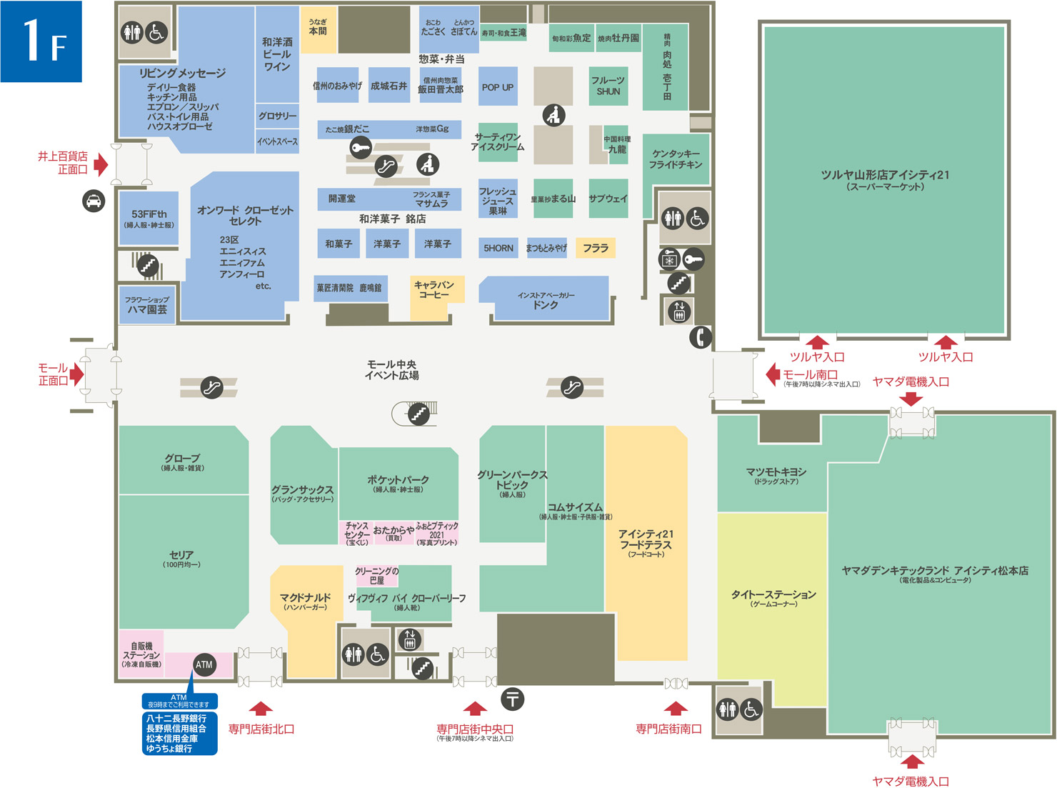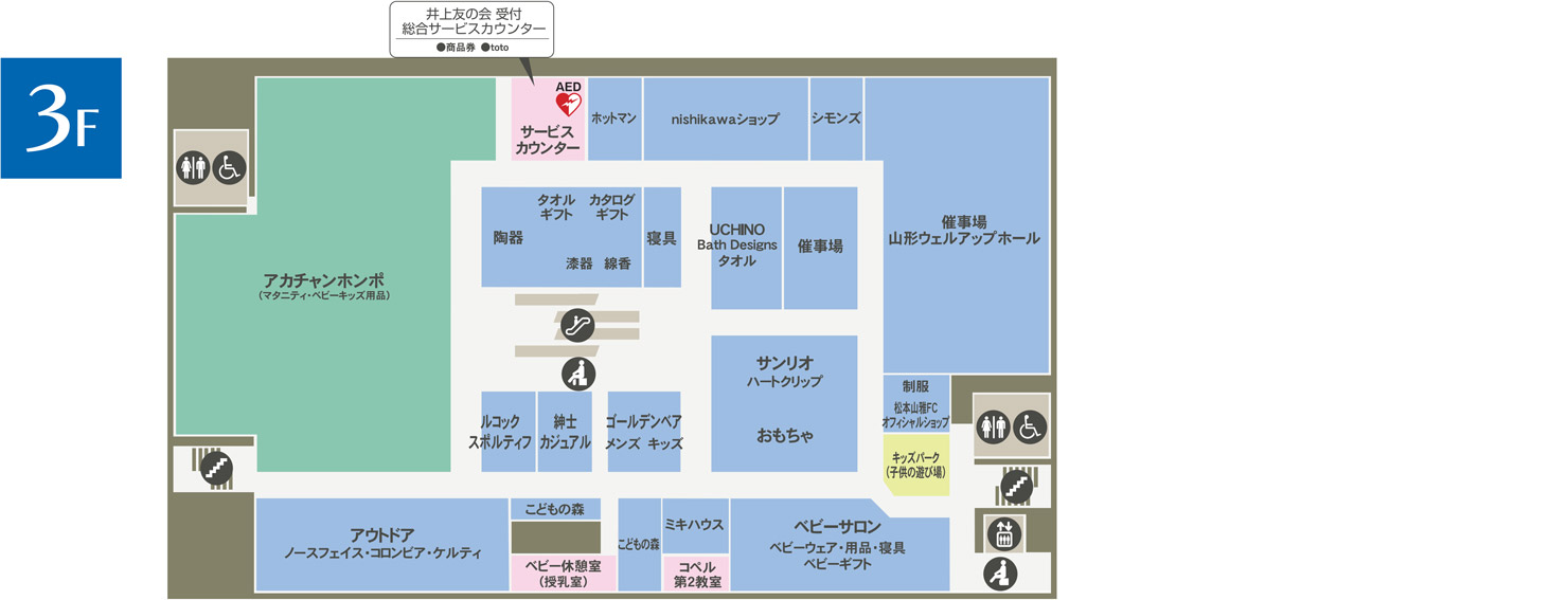 広い通路で楽々お買物 各フロア・各売場の通路を広めにしてありますので、車椅子のままでお買物をお楽しみいただけます。 |