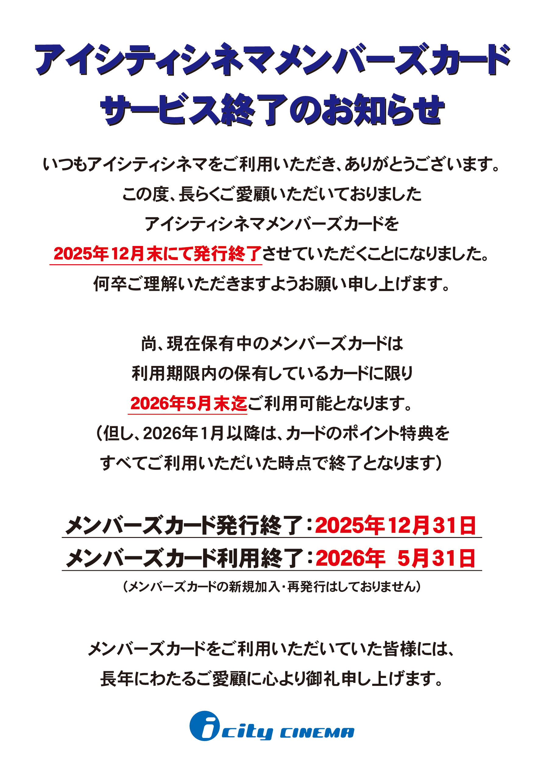 -アイシティシネマメンバーズカード サービス終了のお知らせ-