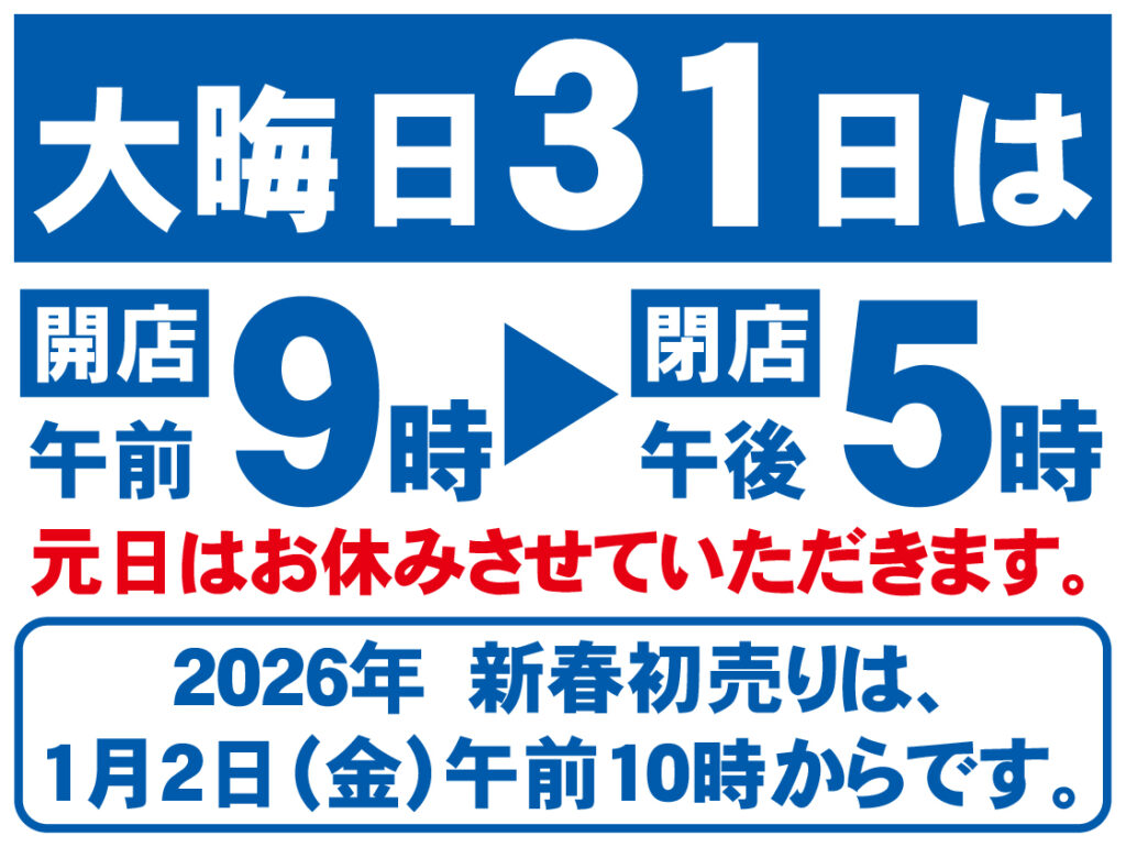 年末年始の営業時間のお知らせ 年末年始の営業時間のご案内です。 ~12月30日(火) 通常営業 12月31日(水) 9時~17時 ※短縮営業 元 日 お休み 1月2日(金)~ 通常営業 12月28日(日)~31日(水) 大歳の市 大晦日のご馳走、おせち料理のご準備に 1月2日(金)~4日(日) 新春初売 福袋、クリアランスなど <お知らせ>1/15(木)~1/2...